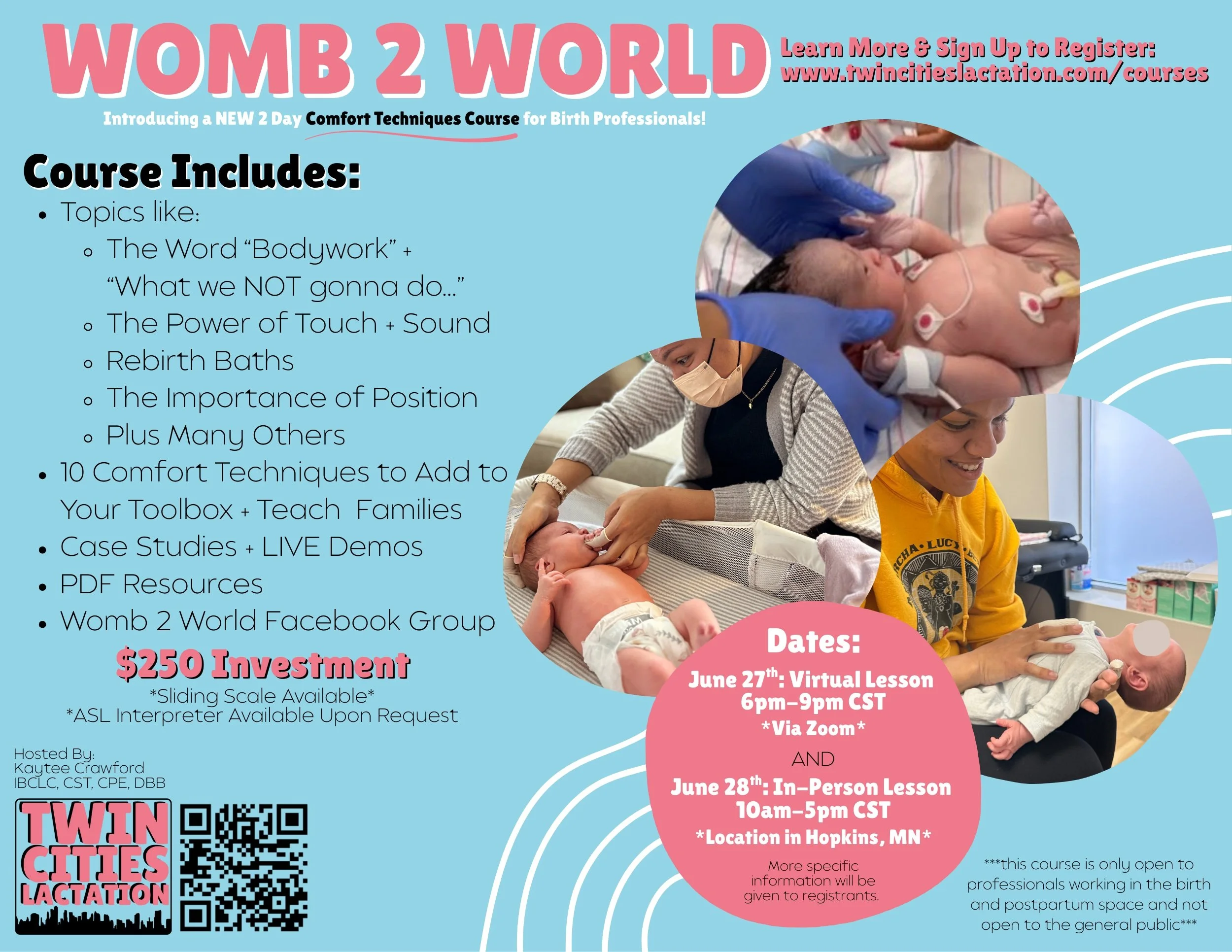 TWO Day Course for Birth PROs! Learn comfort techniques and other supportive tools to support the family and newborn in that early postpartum period. This course is designed to help other professionals be a bridge of support while families wait to see a higher level therapist and/or consultant.